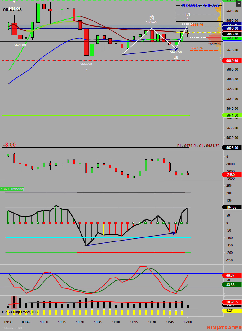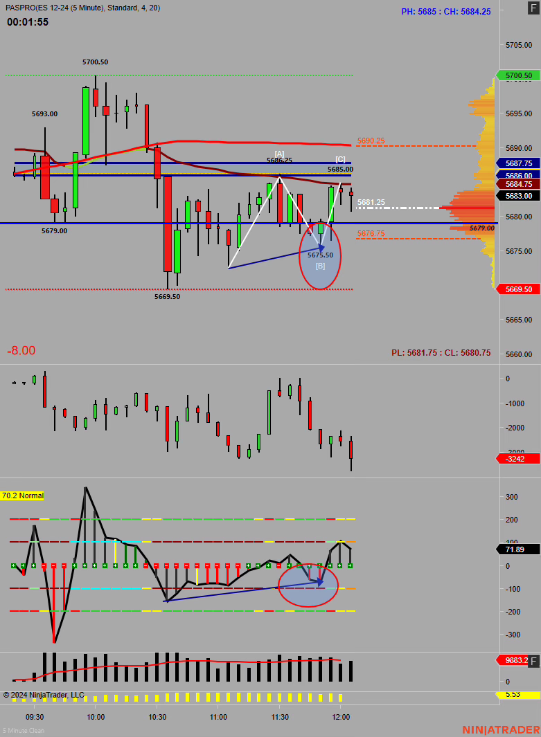 The following 5 minutes S&P futures chart (ES) showing a combination of ABC setup together with CCI divergence , a potential of a momentum move up to test confluence zone of (prior swing high at 5686 + VWAP / 618 Fibonacci projected level) as a target.